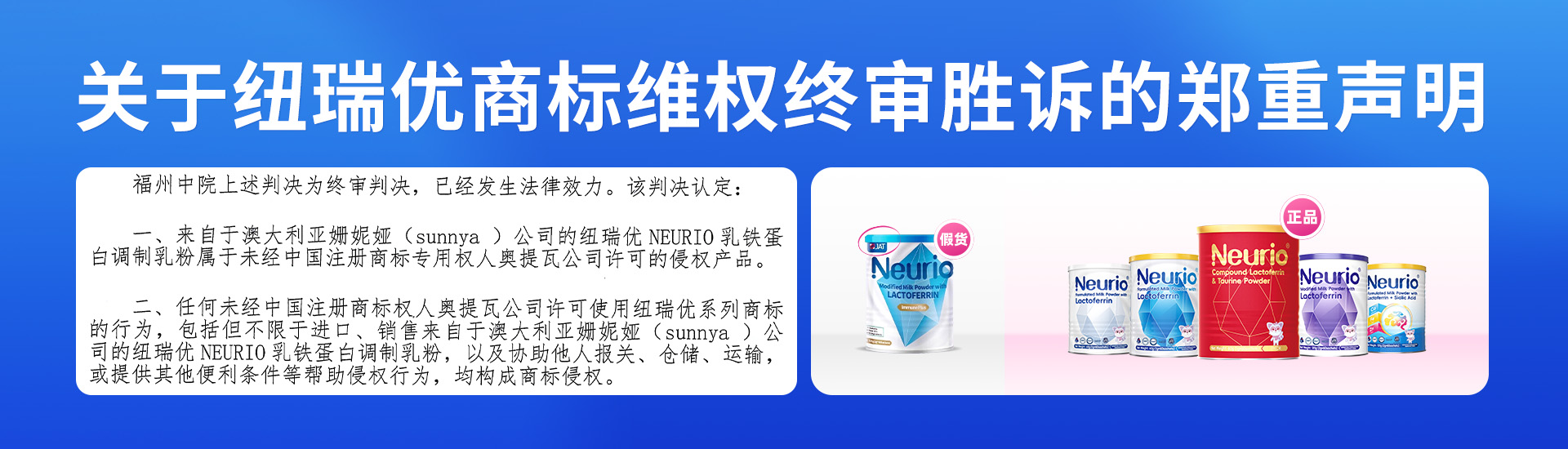 Neurio (中文品牌名:紐瑞優(yōu))意即 “New for You(創(chuàng)新為你)” ,自2011年品牌創(chuàng)建以來(lái), 秉承“創(chuàng)新為你·健康至上” 的理念,讓健康伴隨生活。 紐瑞優(yōu)Neurio產(chǎn)品從國(guó)際引入中國(guó),快速落地生根,并在中國(guó)實(shí)現(xiàn)品牌騰飛!紐瑞優(yōu)持續(xù)努力將自己打造為一個(gè)國(guó)際知名品牌,前期主要以澳新產(chǎn)品為主,現(xiàn)已轉(zhuǎn)型為以國(guó)際產(chǎn)品為主,并堅(jiān)定不移深耕中國(guó)本土化產(chǎn)品,擴(kuò)大國(guó)際營(yíng)銷, 實(shí)現(xiàn)從國(guó)際引進(jìn)中國(guó),再?gòu)闹袊?guó)走向國(guó)際,讓紐瑞優(yōu)品牌再上一個(gè)新的臺(tái)階! 自2015年,紐瑞優(yōu)團(tuán)隊(duì)經(jīng)過(guò)不懈努力成功研發(fā)紐瑞優(yōu)乳鐵蛋白系列調(diào)制乳粉,奉獻(xiàn)給熱愛(ài)健康的人們。 紐瑞優(yōu)團(tuán)隊(duì)專注大健康理念,包括孕產(chǎn)婦與胎兒健康,兒童青少年的健康成長(zhǎng)以及中老年人的健康營(yíng)養(yǎng)需求,不斷推陳出新,為大健康理念貢獻(xiàn)自己的一份力量。 紐瑞優(yōu)永不止步,不斷探索和追尋更新的健康理念,不斷自我超越追求更高的目標(biāo), 不斷努力研發(fā)生產(chǎn)符合市場(chǎng)需求的質(zhì)優(yōu)價(jià)美產(chǎn)品,滿足人們對(duì)健康和高品質(zhì)生活的追求!